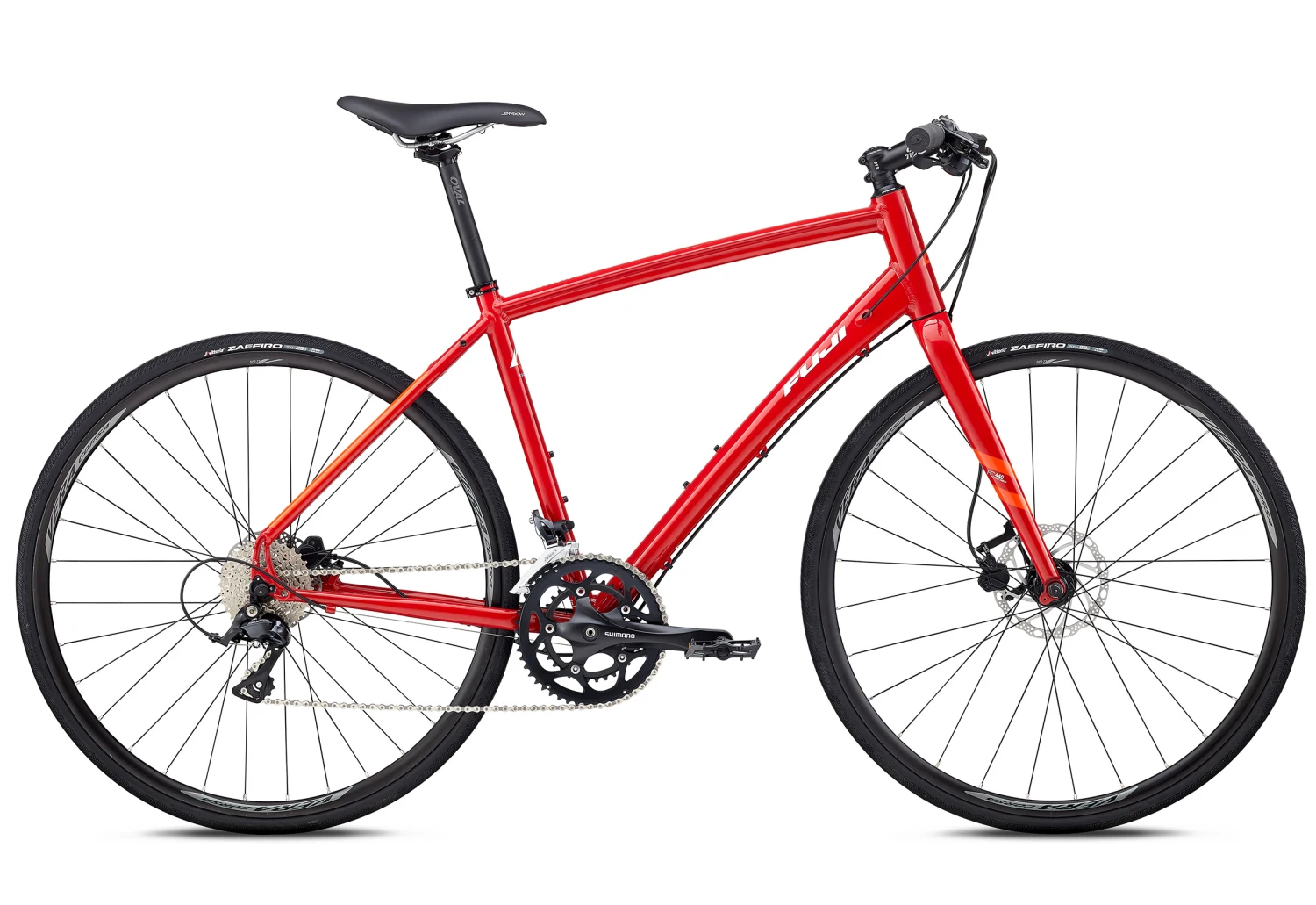 Fuji Absolute’s geometry strikes a balance between speed and comfort, making it great for the fitness-minded rider, or the urbanite looking to ride to work or run errands. Its A2-SL aluminum frame provides the right amount of stiffness for efficiency, with compliance built into key areas for all-day comfort. Its carbon fork keeps you on track with lightweight vibration damping to reduce upper body fatigue, while its aluminum wheels keep the rolling weight low and easily handle rough roads. Hilly terrain will be a breeze thanks to a wide-range Shimano Sora drivetrain, a smooth-operating workhorse gear set that won’t let you down. Powerful Tektro hydraulic disc brakes give you the ultimate in confidence with all-weather braking and easy, one-finger actuation. And, comfort comes standard on the Absolute, thanks to touch points outfitted by Oval Concepts and Selle Royal.
