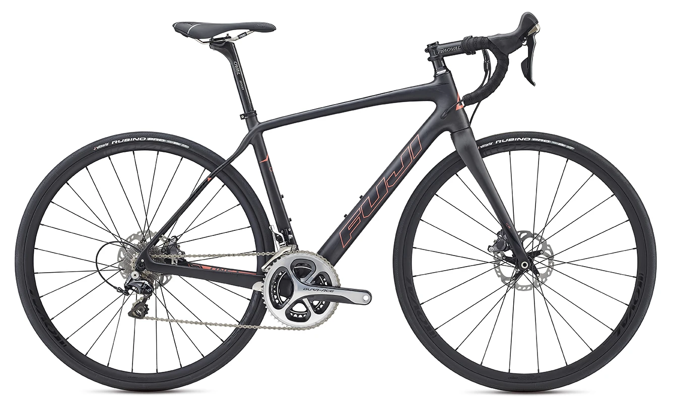 When the spirit of competition dominates your reasons for riding longer distances, the Brevet has to be your rig. The high-modulus carbon women’s-specific frame is designed to reduce energy-robbing vibration and features endurance geometry to put you in the best position for comfortably and consistently producing power through high-mileage events. Light, stiff tubeless-comatible Oval Concepts wheels accelerate effortlessly, while Vittoria Rubino Pro tires offer a plush ride. With a precision Shimano Dura-Ace drivetrain, shifting is silky smooth, and the Shimano hydraulic disc brakes offer exceptional control and modulation. Frame clearance for up to 32mm-wide tires ensures you can explore those rough, less-traveled roads, and hidden eyelets allow for fenders when you need to stay dry. Fuji knows light is fast, so they rounded the Brevet out with carbon bars and seatpost.