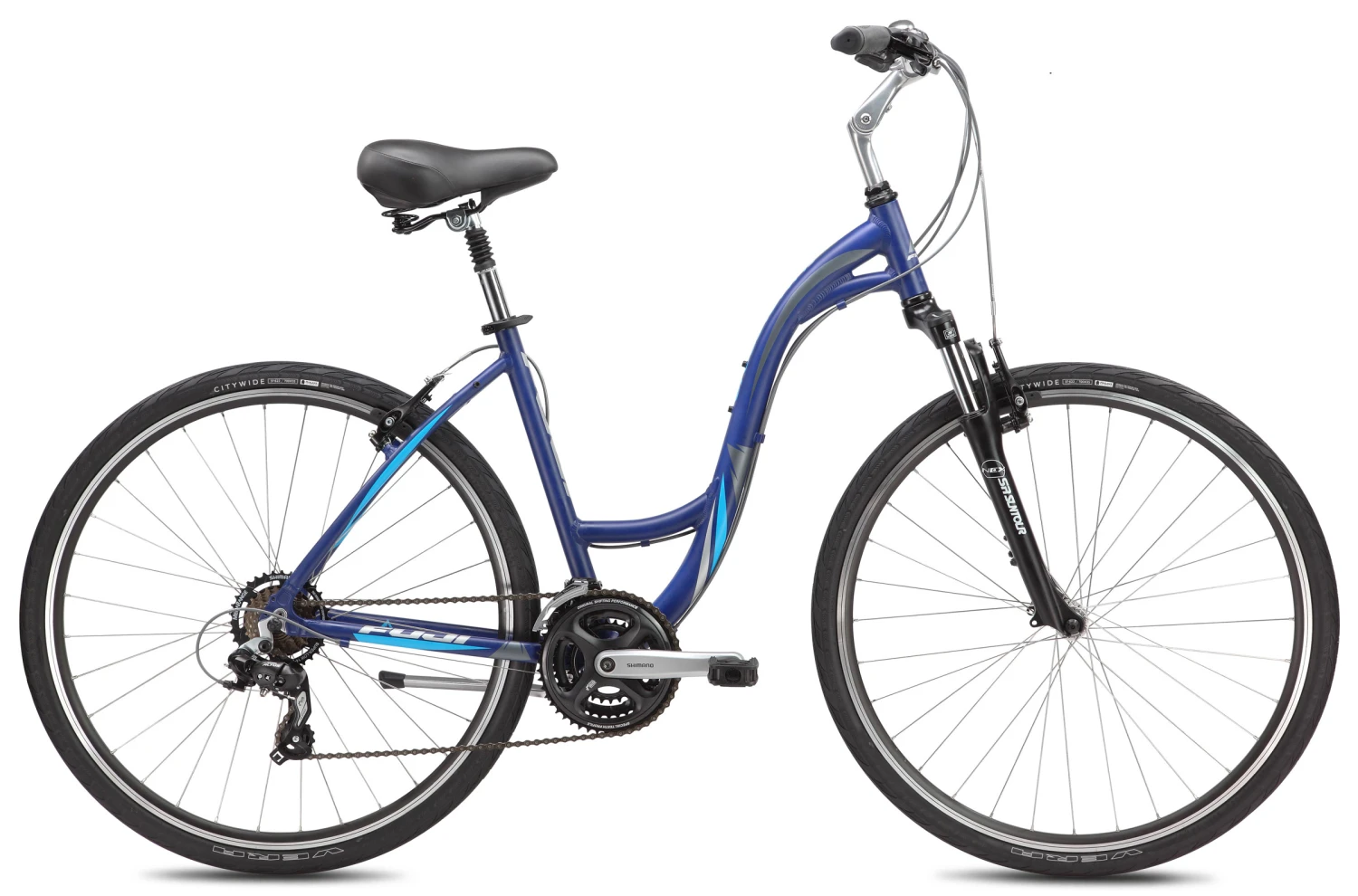 Across town or across the countryside, the Crosstown 1.3 is a great way to have fun while getting some exercise. Fuji’s aluminum frame is light for easy riding and offers a comfortable upright position that lets you cruise longer. This sweet machine also boasts a 21-speed Shimano drivetrain and easy-rolling aluminum wheels that make quick work of hills. And for extra comfort, the ergonomic seat and suspension fork and seatpost smooth even the roughest roads.
