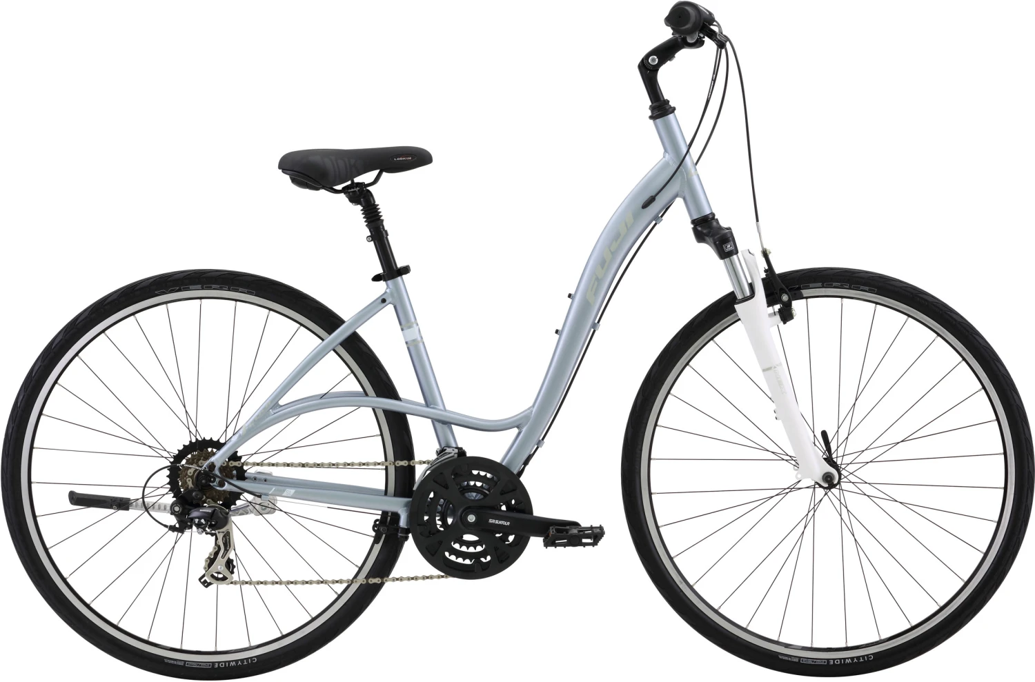Commute in style and enjoy getting in shape with the Fuji Crosstown 2.1 LS. The step-through aluminum frame allows easy on/off, while the upright riding position provides a comfortable and back-friendly ride. Feel free to take a shortcut on a dirt road since the Suntour suspension fork soaks up any bumps that get in your way. Handlebar-mounted Shimano Revo shifters and a 21-speed drivetrain chew up climbs, while fast-rolling 700c Vera Terra wheels with 35mm-wide Vera CityWide tires provide comfort and traction through the corners. You’ll also love the Selle Royal seat with comfort gel.