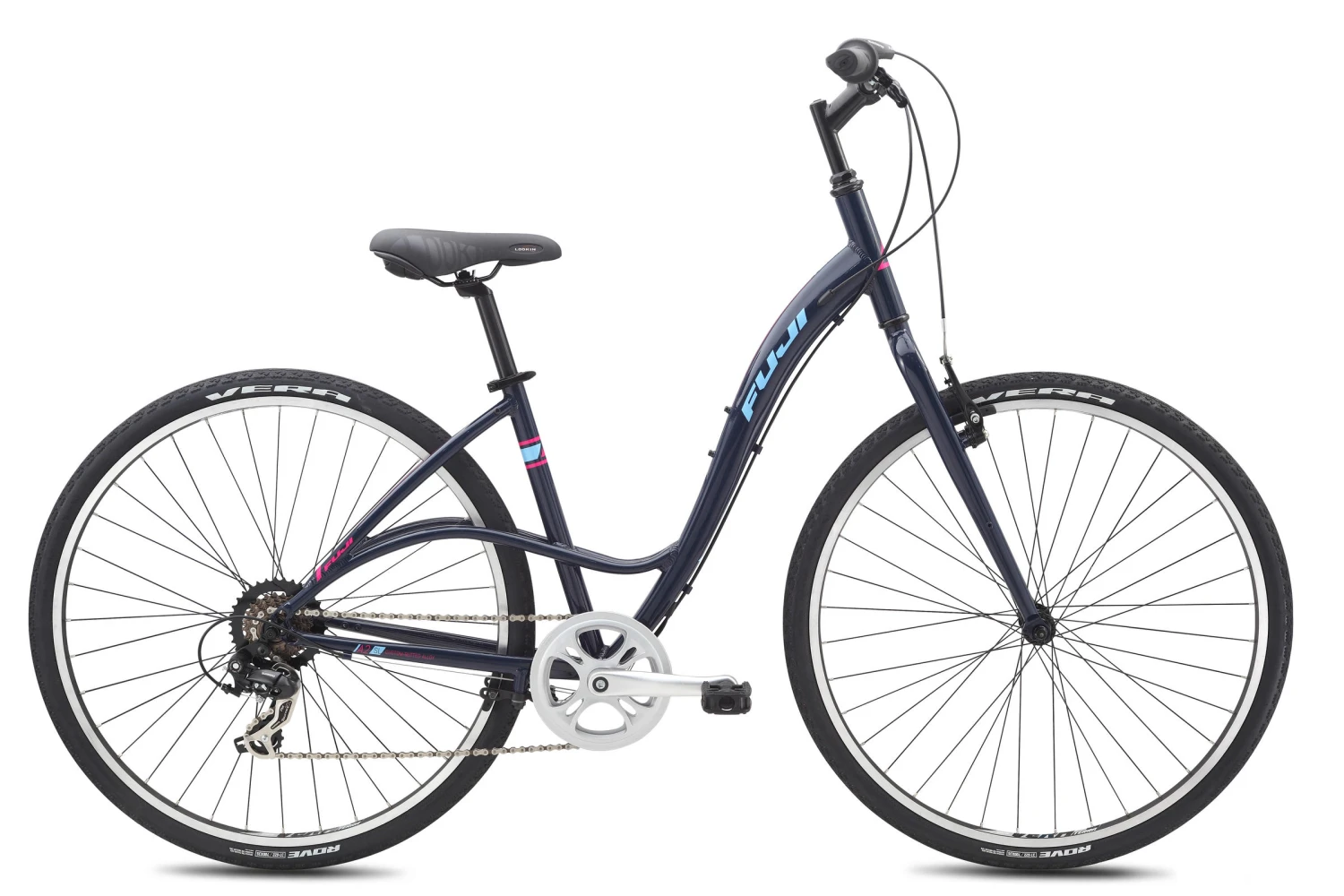 Riding with the kids, riding for fitness, or just riding for fun: Fuji’s Crosstown 2.3 LS is built for your day on the bike. This versatile bike is ideal for trips to work, the store, and around town. Fuji’s A2-SL step-through frame is light and nimble, while the natural upright riding position and suspension fork offer amazing comfort. Plus, 7 gears are at your fingertips to keep you spinning easily up hills, while the powerful brakes keep you in control on the way back down. And, for extra comfort, the ergonomic women’s-specific seat lets you float comfortably down the road.