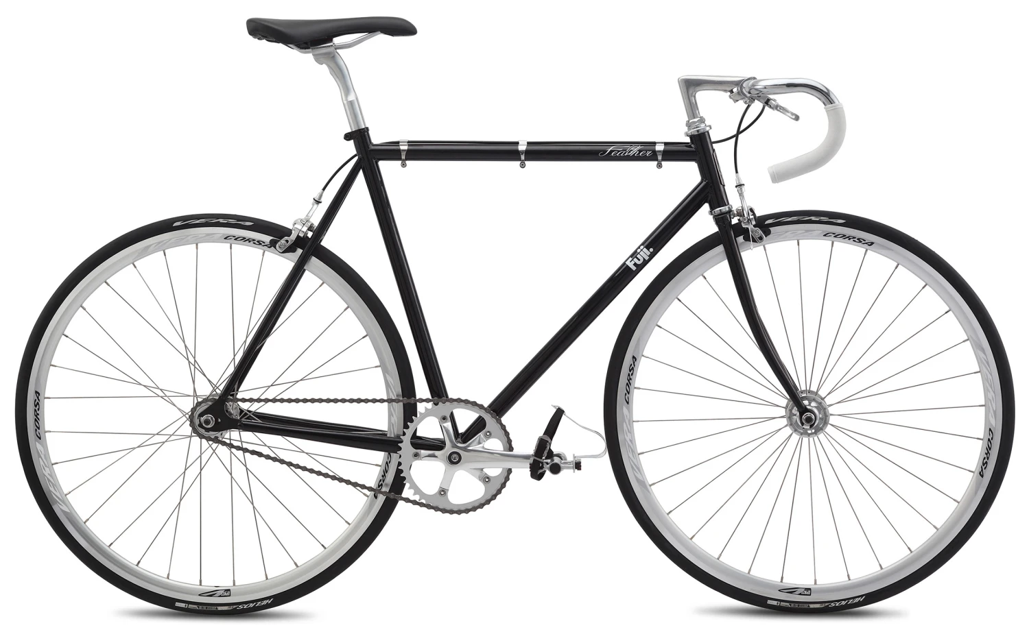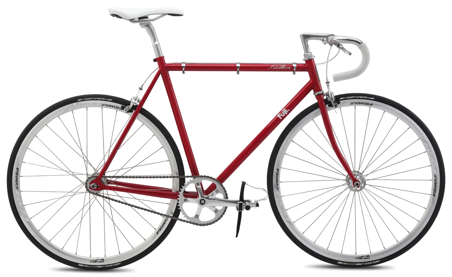 Inspired by the look and feel of classic track bikes, Fuji’s Feather is perfectly at home navigating through an urban environment. The classic track geometry and rear-entry dropouts add to the clean lines of the comfortable steel frame. The high profile 700c rims add a modern twist to the classic style, while keeping you rolling quickly and easily. Whether you decide to ride fixed or free on the flip-flop rear hub, the powerful dual-pivot brakes will keep you in control.