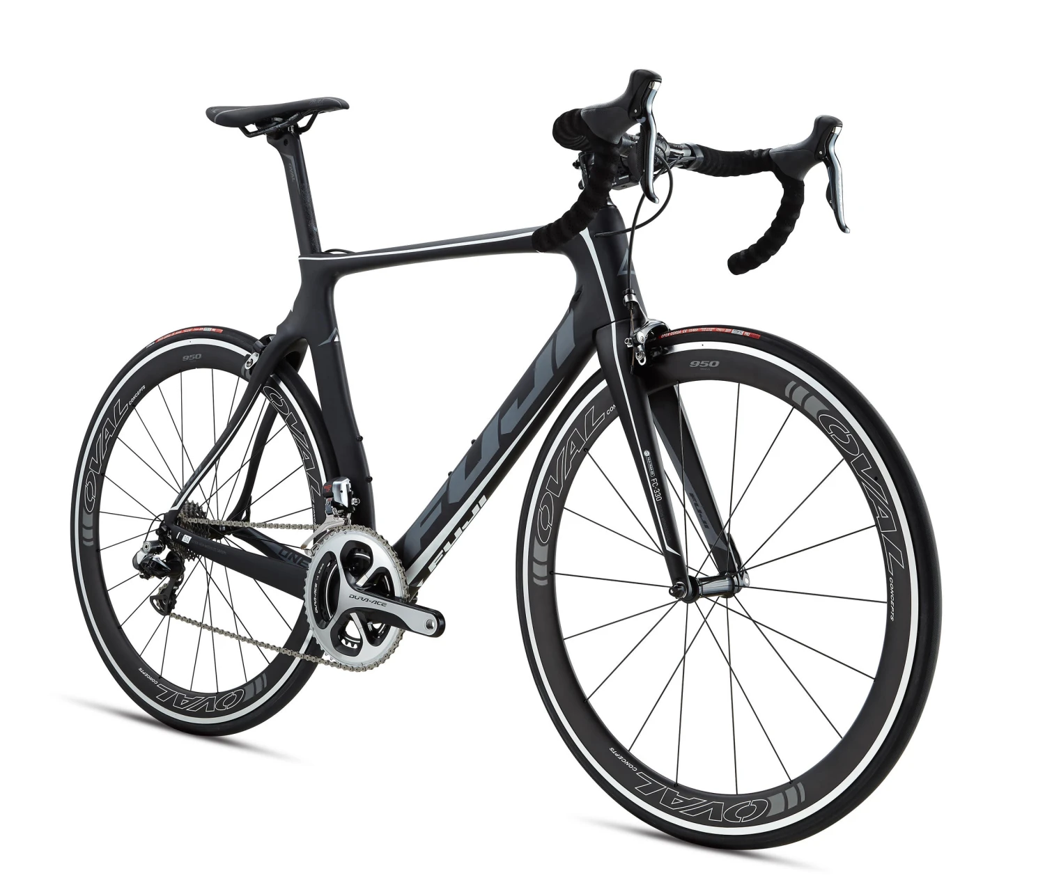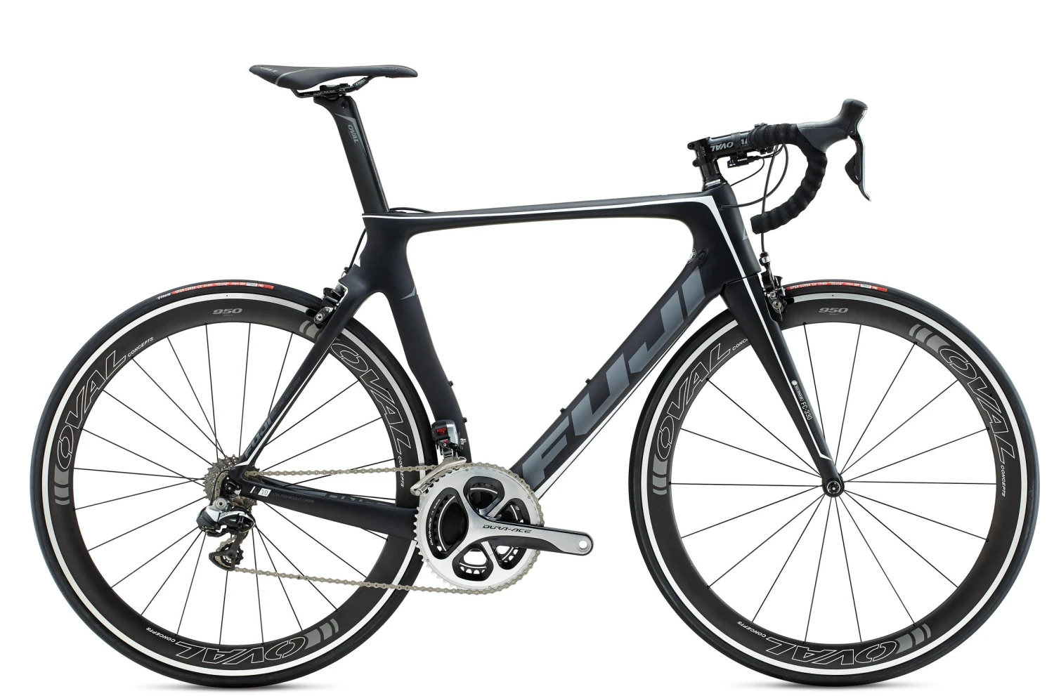 Don’t mind the incredibly loud whip-crack—that’s just the Fuji Transonic 1.1 shattering the sound barrier. You’ll feel years of Fuji’s aero engineering pay off as their extremely light and stiff C10 ultra-high-modulus carbon frame propels you through the air like a supersonic jet doing Mach 1. Oval’s 950F carbon wheels with aluminum brake tracks are almost impervious to wind drag as they accelerate quickly up to speed. Bank like an F-16 through the corners thanks to the full-carbon, tapered fork that delivers pinpoint steering precision. Shimano’s internally-wired, top-end electronic Dura-Ace Di2 drivetrain provides impeccably smooth, relentlessly reliable shifting, and the direct-mount Dura-Ace brakes keep the weight down and the aerodynamics up. Finally, an aero carbon seatpost, a lightweight stem and bar, and a fine seat from Oval Concepts ensure you’re flying with finesse.