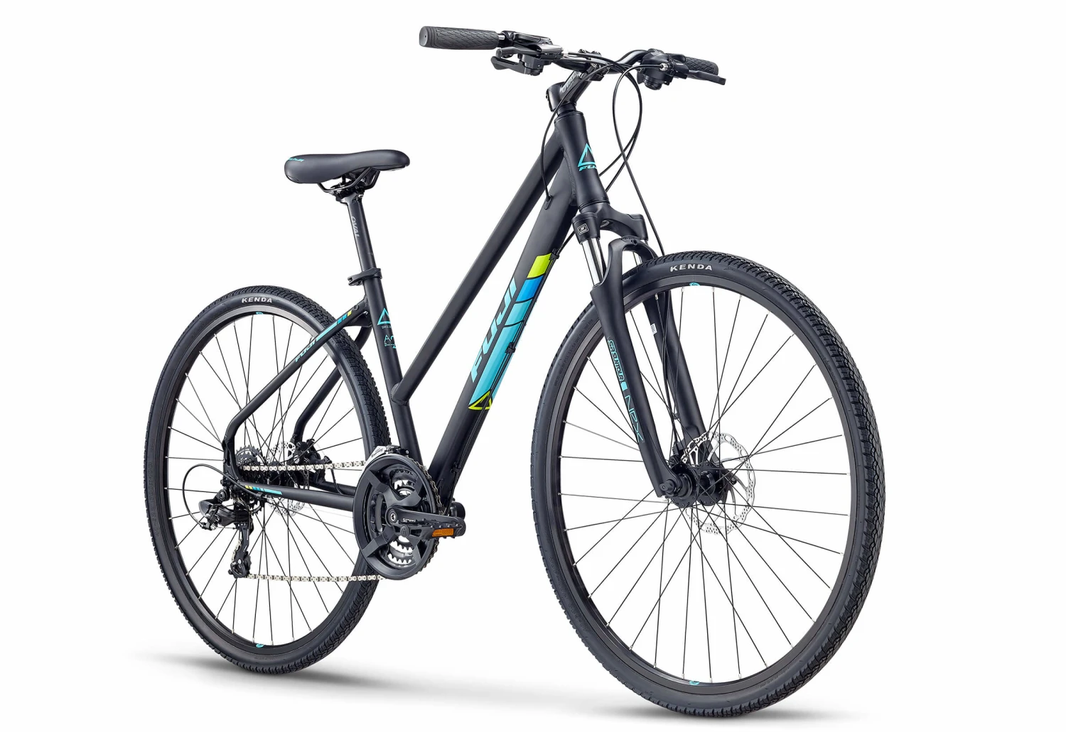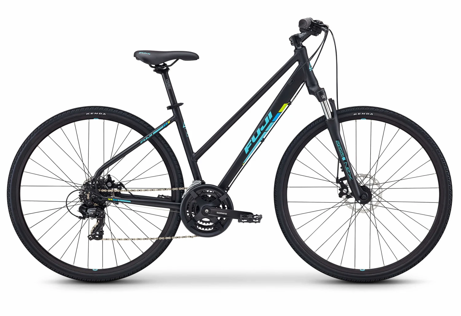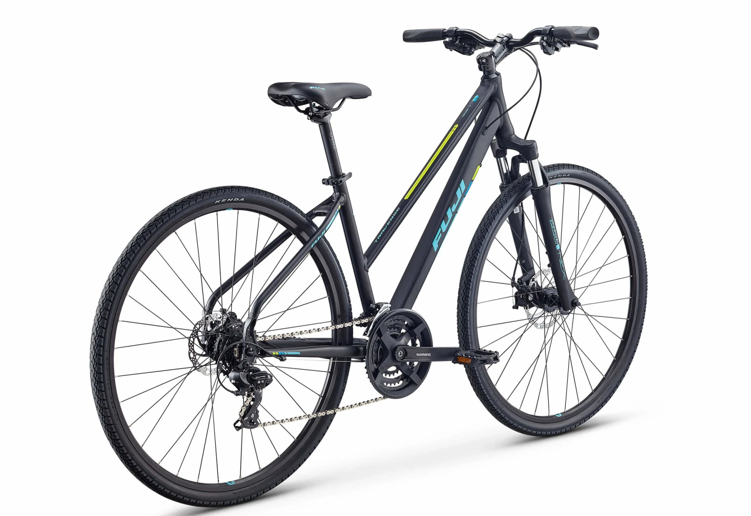 Constructed of custom-butted A2-SL aluminum that is strong and lightweight, the Traverse is a city trekking bike with dirt-loving attitude. Equipped with 700 x 40c tires, a suspension fork, and disc brakes, it blends the stable handling and durability of a mountain bike with the speed and precision of a road bike. And, Fuji’s step-through designs ensures easy on and off. For work commutes, errands around town, and path rides through the woods, a wide range of gears keeps you moving efficiently, powerful disc brakes provide confident stopping in wet conditions, and the Oval women’s saddle offers ride-all-day comfort. For true all-purpose use, rack and fender mounts add carrying capacity and all-weather utility.
