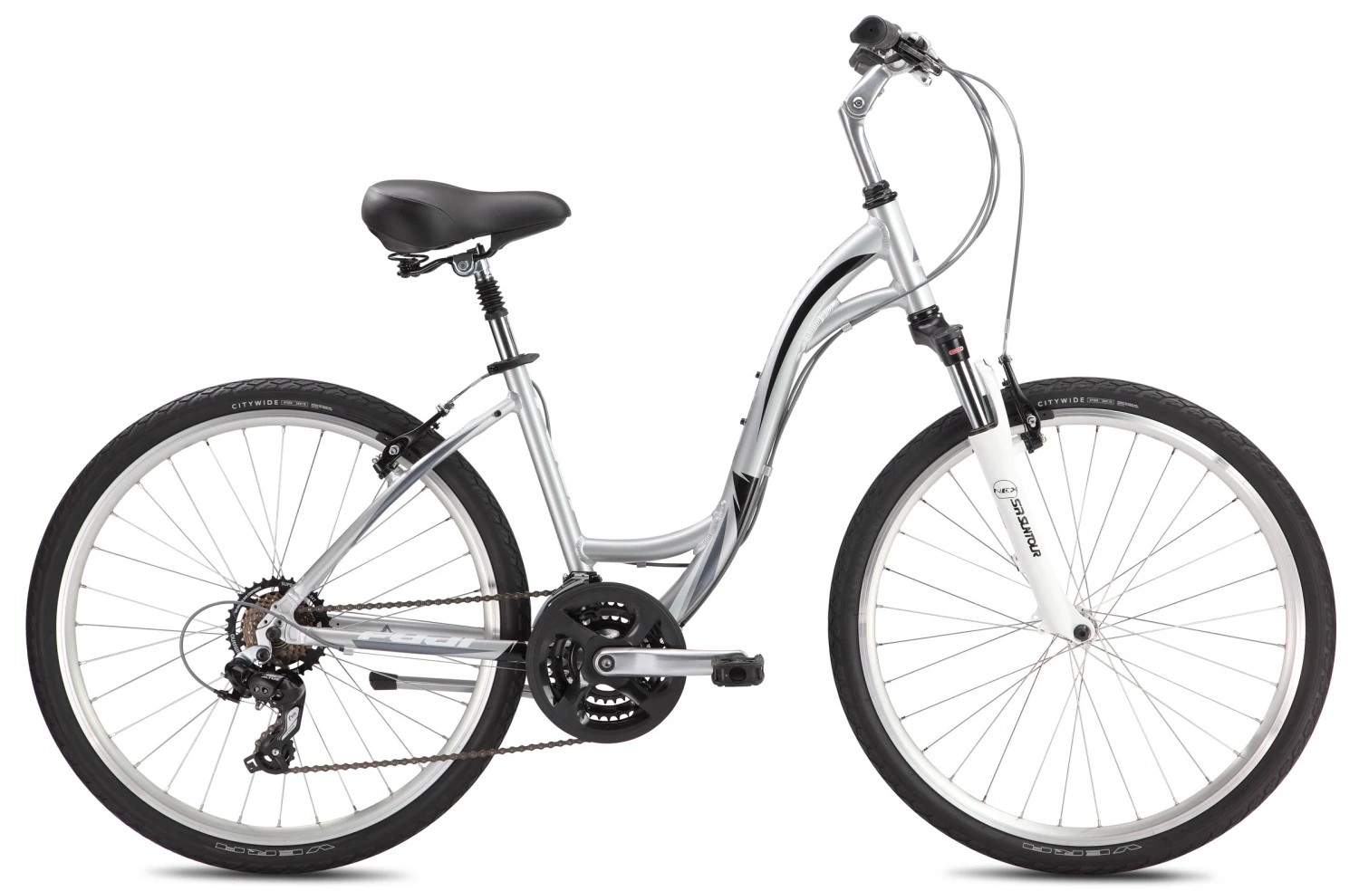 A wonderful blend of comfort, agility and low weight can be found in Fuji’s Crosstown 26 1.3 LS. Its low-standover aluminum frame delivers a fun, stable ride, perfect for commuting, getting in shape or just cruising around town. For extra comfort, the Crosstown boasts a supportive ergonomic seat as well as a suspension fork and seatpost to smooth even the roughest roads. And, the 21-speed Shimano drivetrain and fast-rolling wheels let you pedal easy for miles of cycling enjoyment.