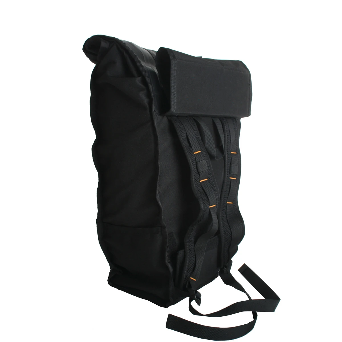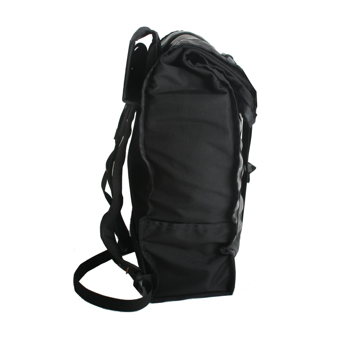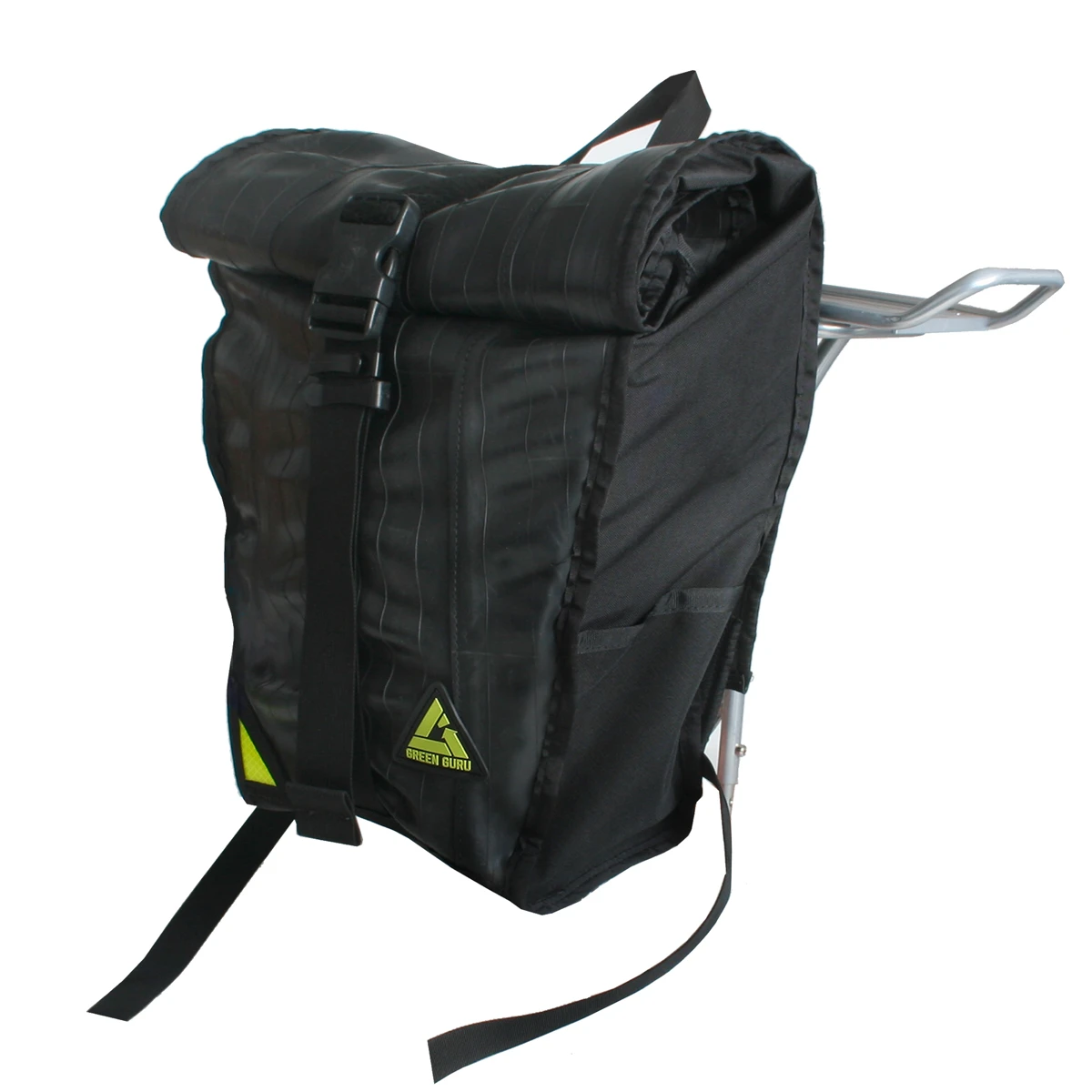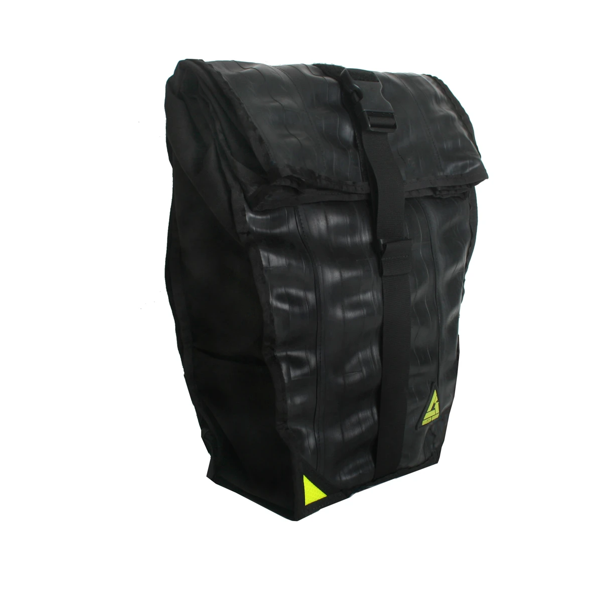 The High Roller is a super-durable and sleek bike pannier, made from upcycled bicycle inner tubes and recycled fabric, that serves as a backpack off the bike. With its stormproof construction and striking good looks, it keeps the elements at bay while you ride. The quick mount system secures to virtually any rack system.