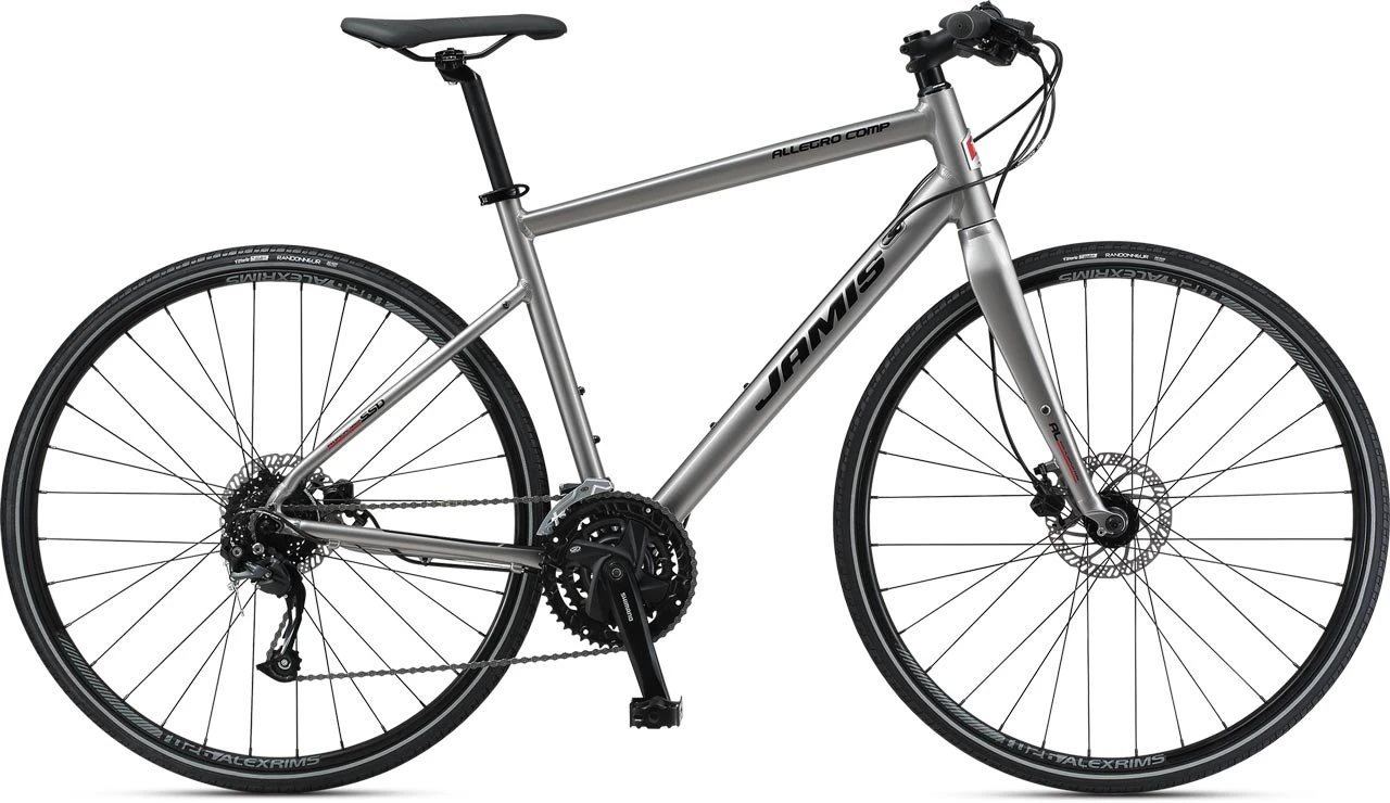 Musically speaking, Allegro means quick and lively, which exactly characterizes the spirit of Jamis’ Allegros: fitness bikes that are lively, quick, and seriously fun to ride. Allegro Sport blends the speed and efficiency of a road bike with the heads-up riding position many people prefer. It has double-wall alloy rims and fast, 700c tires that slice through the miles with ease and Tektro hydraulic disc brakes that bring you to a controlled stop in any conditions. The combination of a 27-speed road bike drivetrain, flat bar shifters, and lightweight aluminum frame and fork means you can Gran Fondo it on the weekend, then race through traffic during the week.