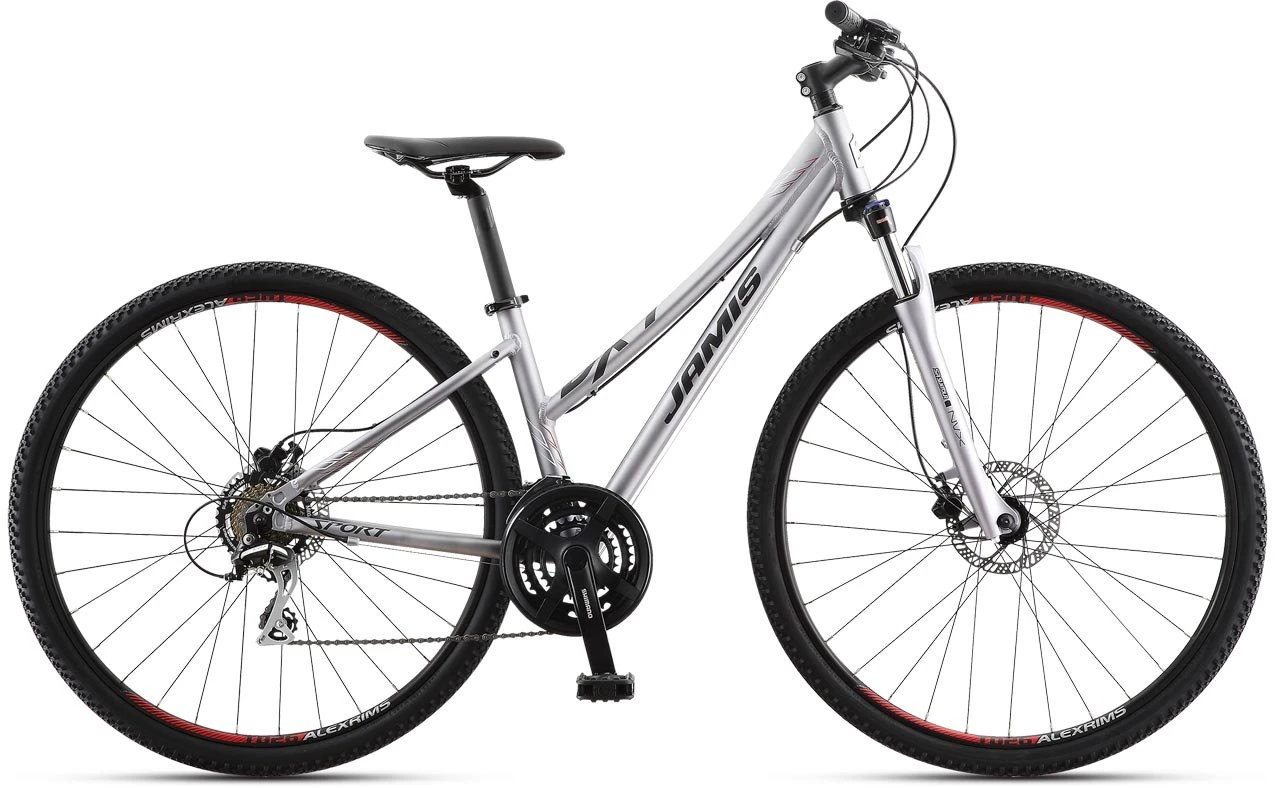 The dual-sport Jamis DXT is a pumped-up version of the Allegro fitness bikes. DXT Sport Step-Over has a greater 24-gear range to take on steeper hills and tougher terrain, along with wider, more trail-capable tires for access to more riding areas. You’ll have no problem stopping on a dime with hydraulic disc brakes that offer outstanding braking power and control in any conditions, while a suspension fork smooths out those choppy roads and rough trails for a pleasant ride, wherever you take your DXT.