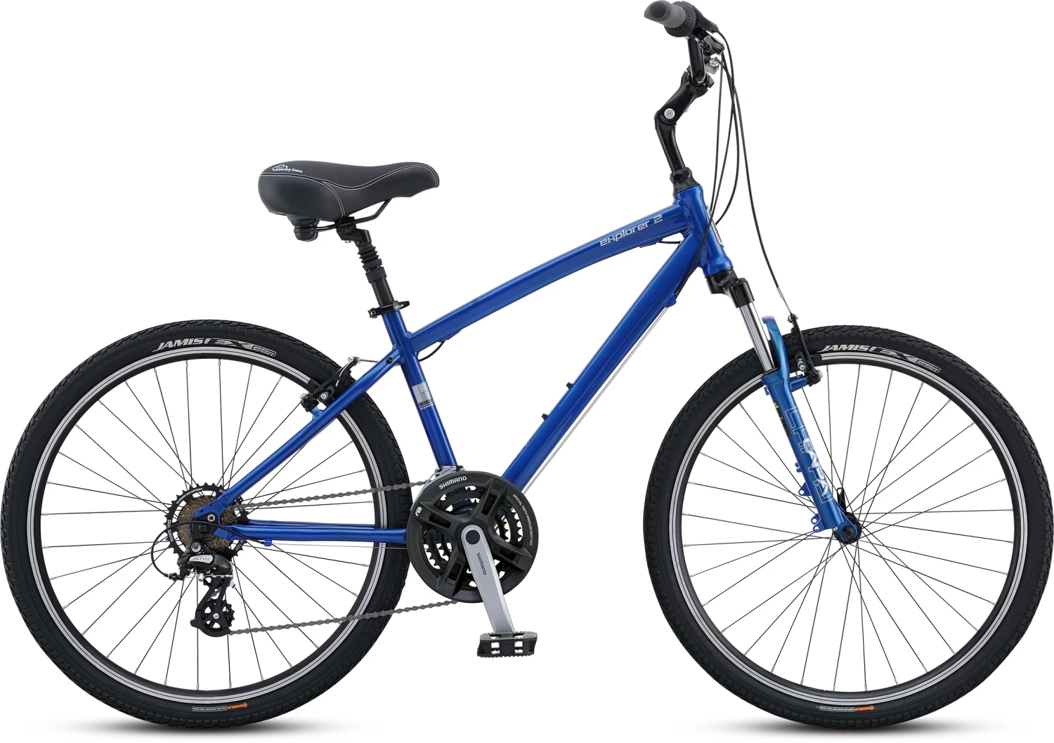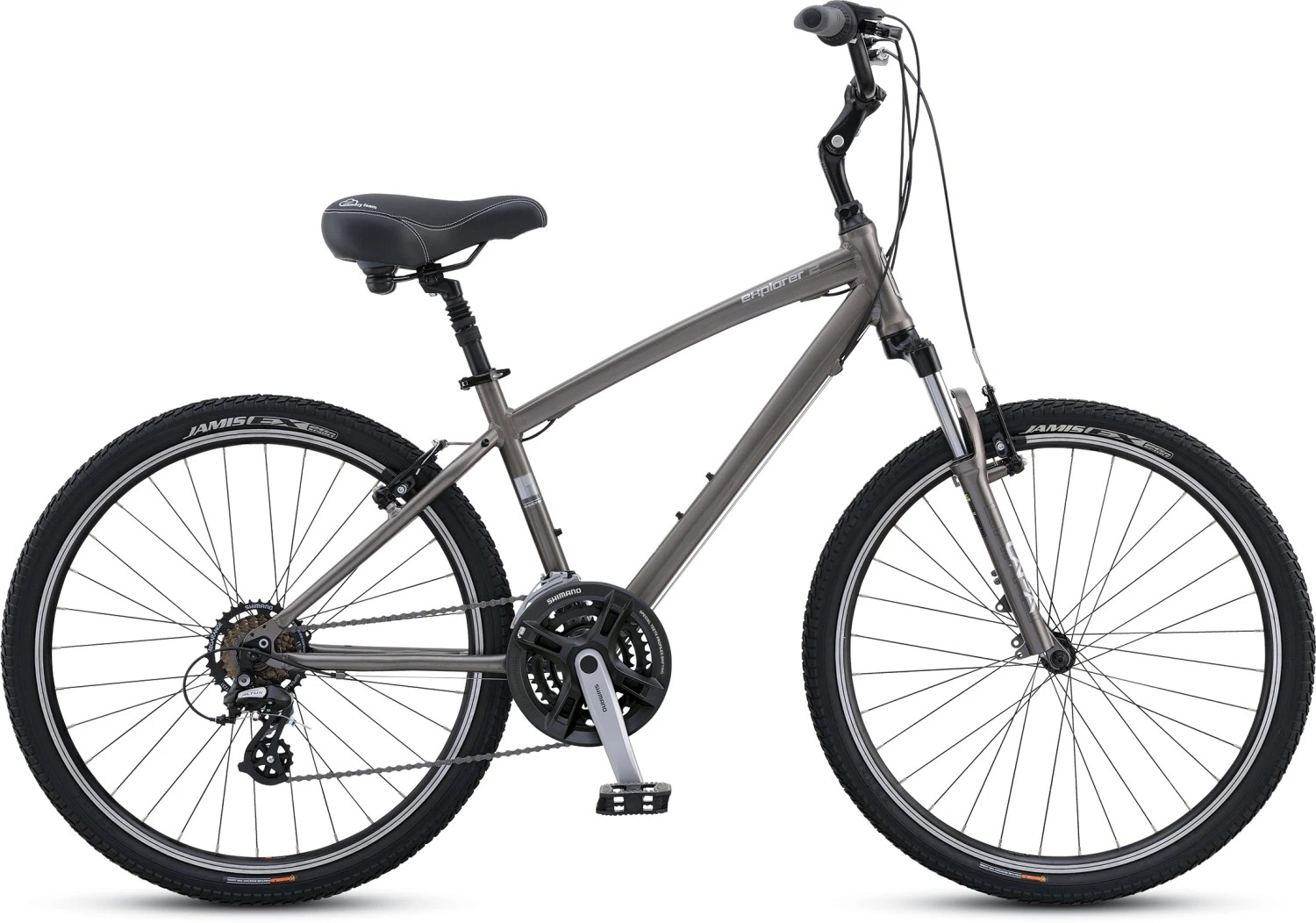 Take Jamis’ Explorer 2 on bike path explorations, road excursions and even gentle country trails. The superbly comfortable ride sports an upright riding position, a light 6061-aluminum frame, a suspension fork and a suspension seatpost. A 21-speed Shimano drivetrain makes easy work of hills and Tektro brakes provide control for the way down. And, the Explorer’s wide, puncture-resistant tires float over rough roads and grip corners with confidence.
