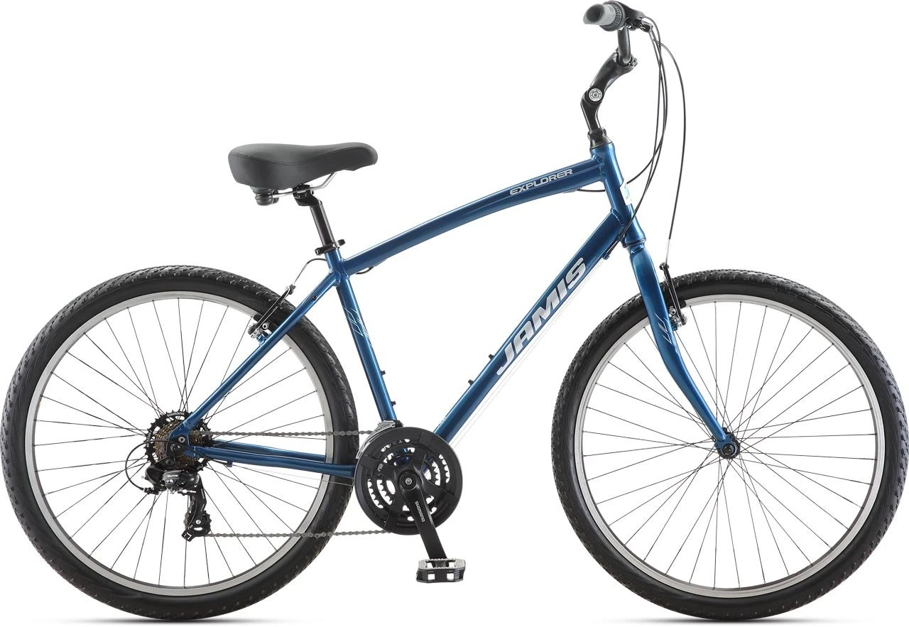 The Explorer has been one of Jamis’ best-selling bikes ever since its introduction in 1982. Originally designed as a mountain bike, the Explorer has since evolved into a very practical and very comfortable sport comfort bike. The Explorer’s aluminum frame feels lightweight and nimble, and the long angle-adjustable stem and 80mm rise handlebars offer an upright riding position that’s easy on neck and wrists. The 21-speed Shimano twist-shifting drivetrain with Altus front derailleur and 14-34 Mega-Range freewheel make hill climbing easy. And, Tektro’s CL530 brake levers offer slip-resistant, shock-absorbing inserts on the finger contact points for more secure, comfortable braking that enhances control, even on hills.