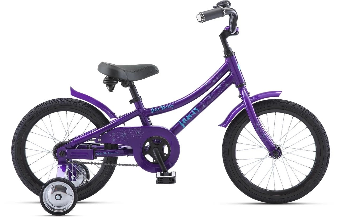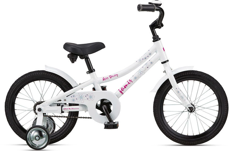The full-length and full ring-wrap chainguard on the Jamis Miss Daisy keep clothes and legs cleanly and safely out of the way of the chain. Those attractively painted fenders keep the rain and mud off the bike and the rider, and look cute to boot. The soft and comfortable foam grips feature a smooth vinyl cover that is embossed and stitched to match the saddle and decal theme. Those wide Brooklyn Speedway tires offer a large contact patch for greater stability, with a smooth tread surface for easy rolling, and hold plenty of air volume for a more comfortable ride. The pedals offer a non-slip insert that keeps feet and shoes in full contact even when wet for safe and secure pedaling, too. Every 16-inch Miss Daisy offers stabilizing training wheels that assist the young rider in learning how to pedal, steer, and balance a bike for the first time. The training wheel support struts attach securely both to the rear hub axle and the frame itself so that the training wheels don’t rotate out of plane with the rear wheel, preventing tips or spills.
