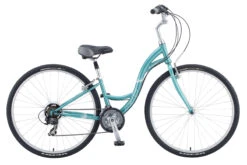 The Brentwood Ladies hybrid bike is all about comfortable recreation. With high handlebars, a cushioned seat, and suspension seatpost you’ll enjoy a plush, upright riding position that lets you take in the sights as you cruise. Alloy 700c road wheels and fast-rolling city tires transition from pavement to dirt paths with ease, and the 21-speed drivetrain gives you plenty of gearing for climbing hills or spinning across the flats.