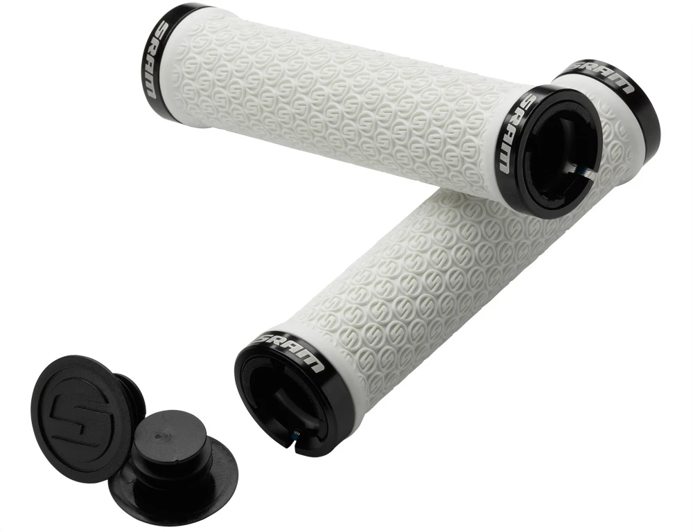 SRAM’s Locking Grips have clamps on both ends for a secure bar hold. Their rubber surface and “S” logo design offer a great feel.